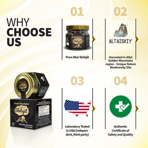 • Résine de Shilajit pure à 100 % : Recueillie à haute altitude dans la chaîne de montagnes de l'Altaï, une région propre et diversifiée de la partie centrale de la Sibérie, réputée pour sa richesse en minéraux et sa propreté écologique.