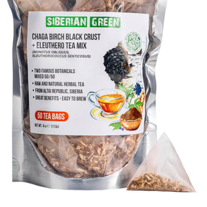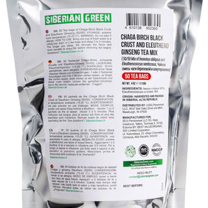 Notre thé Chaga avec racine d'éleuthérocoque provient entièrement et durablement de Sibérie et contient un mélange 50/50 de champignon chaga et de racine d'éleuthérocoque, ce qui le rend très nutritif et facile à utiliser puisqu'il est emballé dans des sachets de thé.