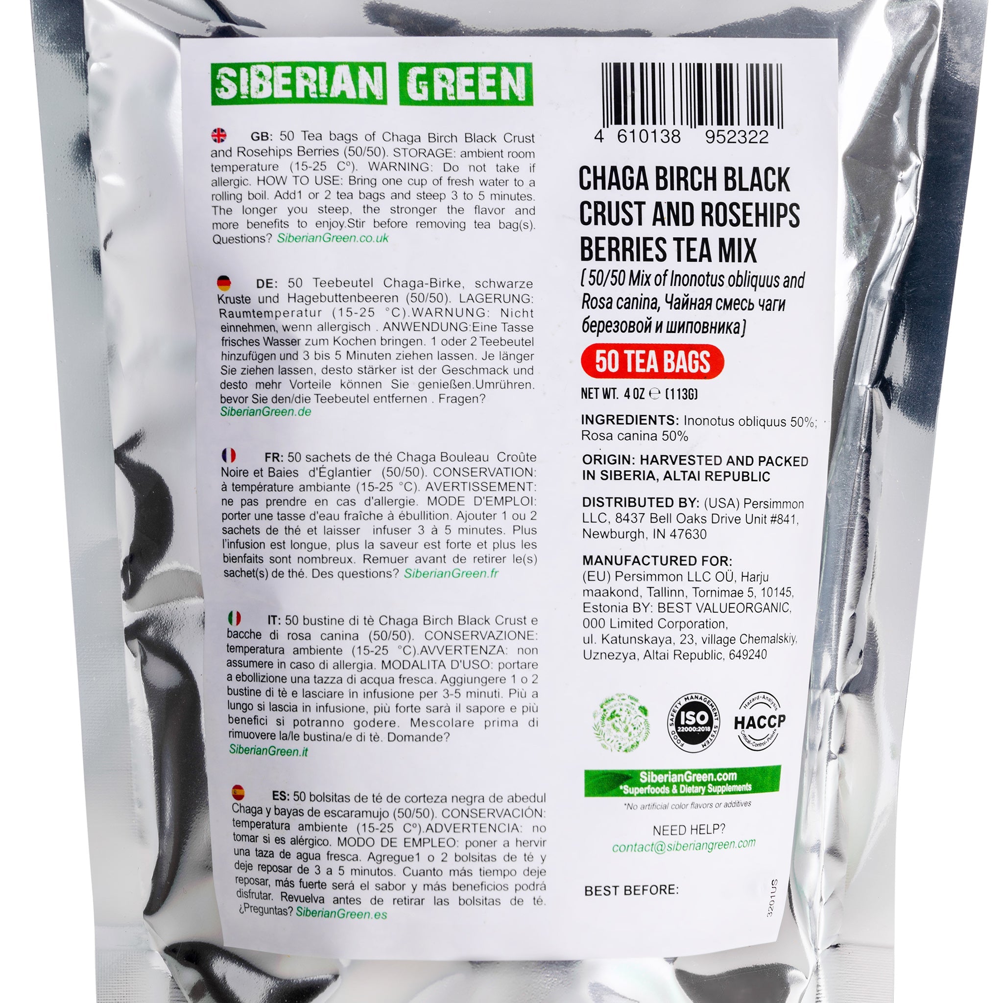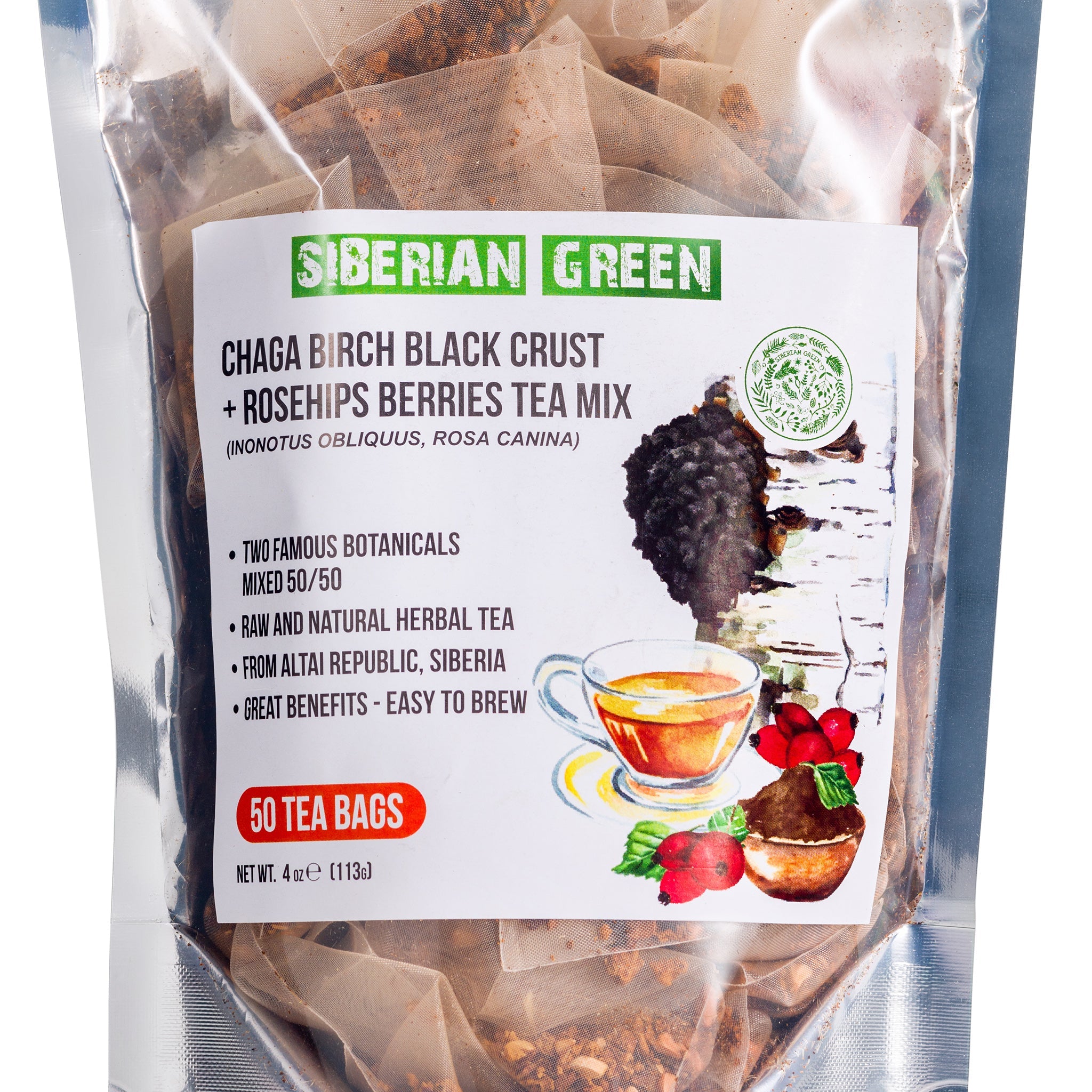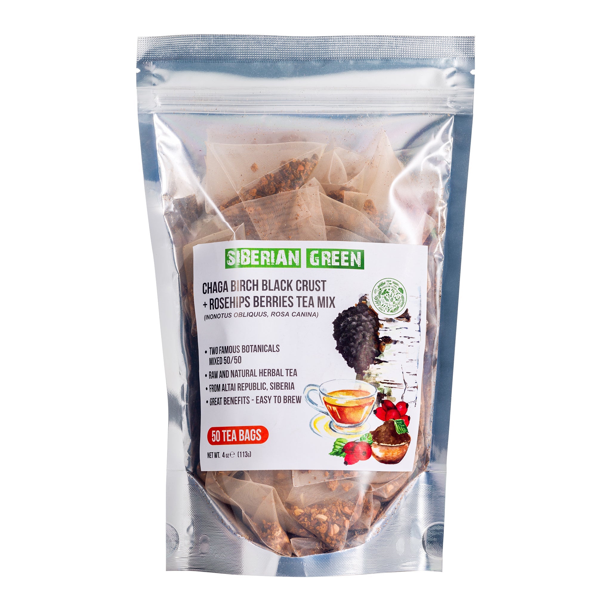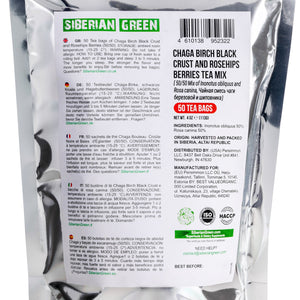Trying Siberian Green Chaga Tea with Rosehip Berries vous offre les bienfaits naturels du chaga. Il s'agit d'un mélange 50-50 de champignons chaga récoltés à l'état sauvage et de baies d'églantier riches en vitamines. Ce thé regorge d'antioxydants qui contribuent à nourrir et à renforcer le système immunitaire. Il provient de la région intacte de l'Altaï, en Sibérie orientale.