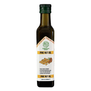 L'huile de pignon vert de Sibérie est une excellente huile naturelle, pressée à froid, produite à partir de pignons de pin récoltés à l'état sauvage dans la forêt vierge de la taïga, près des sources chaudes curatives des montagnes de l'Altaï. Cette huile de pignon de pin extra vierge de première qualité et de variété unique contient une multitude de nutriments et est traitée par une extraction traditionnelle de première pression à froid qui protège ses solides bienfaits pour la santé, sa saveur subtile et sa couleur dorée claire.
